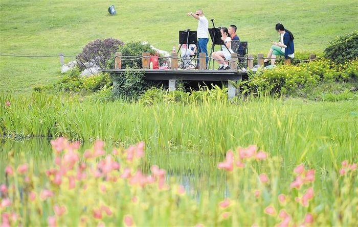 “确实安逸,风景好空气又好,比公园还漂亮,骑车走路都是一种享受。”看完龙舟赛,陈振峰“按图索骥”,根据网上的攻略来到了泛战旗景区的柏条河绿道,清澈的河水潺潺流淌,一路上,绿道两侧种植了薰衣草、格桑花、雏菊,一步一景,沿途还有湿地小景,配套有供游人休憩的亭子座椅。