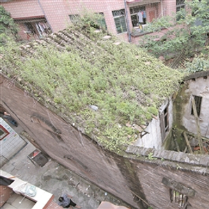 | 故居起居室屋顶部分长草,部分坍塌。 |
