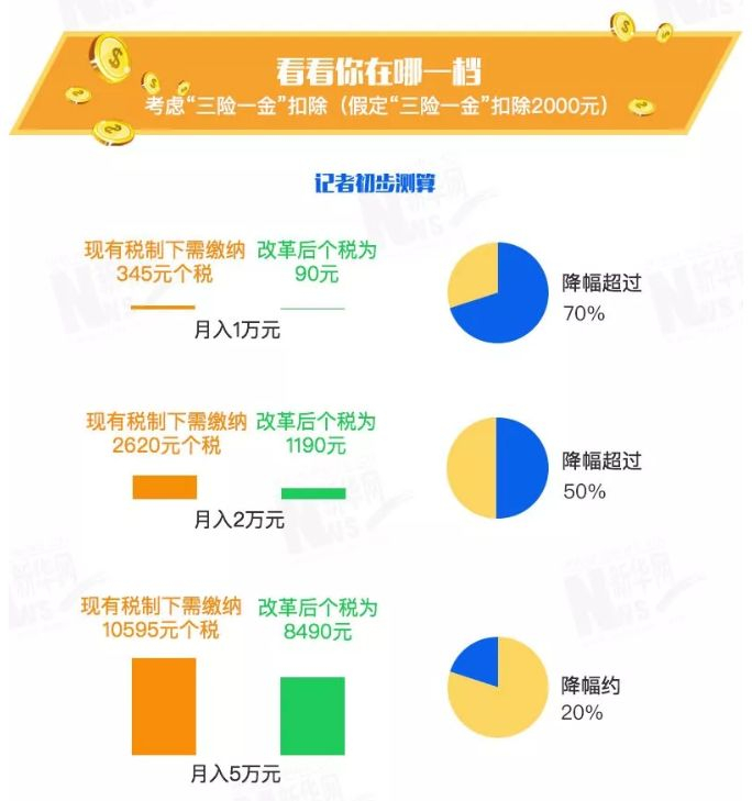 月入5万元者,现有税制下需缴纳10595元个税;改革后个税为8490元,降幅约20%;