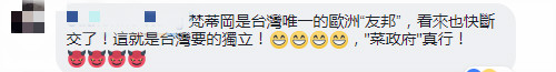 在社交媒体上,除了纷纷预言“台梵终于要‘断交’”,台网友更犀利指出蔡英文政府终于把台湾处境“作”到这一步,并主动为台当局“宽心”:对今天的局面,民进党早该有所预料,与台湾“断交”更是国际社会大势所趋、不必意外。