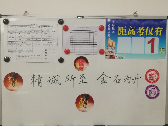 高考前一天,项涵在老师办公室的小白板上写下“精诚所至 金石为开”。记者 刘嵩 摄