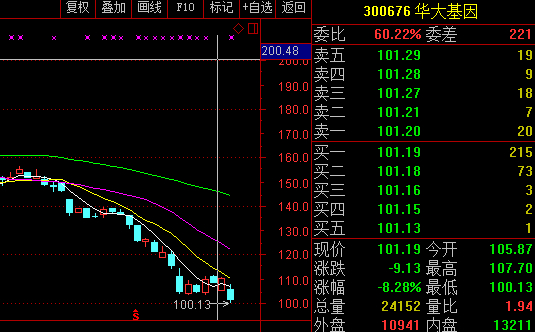或受此消息影响,华大基因今天开盘就低开低走。截至6月27日收盘,其收盘价为101.19元/股,大跌8.28%,成交量达到了一个半月以来的峰值,股价有进一步下跌的可能。