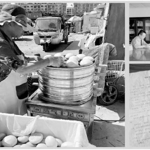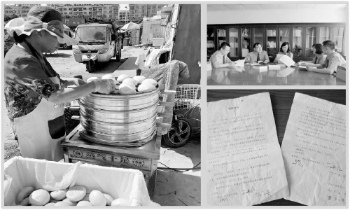左①生活恢复平静的于秀敏在打理自己那份小生意;右上②检察官研讨案情;右下③来之不易的和解协议书