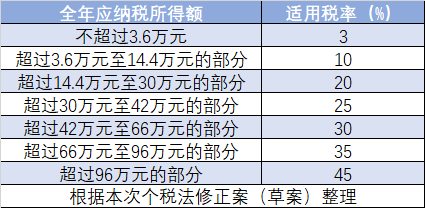 相较以前的税率表,没有变化的是,30%、35%、45%这三档较高税率的级距保持不变。超过42万元至66万元的部分为30%、超过66万元至96万元的部分为35%、超过96万元的部分为45%。