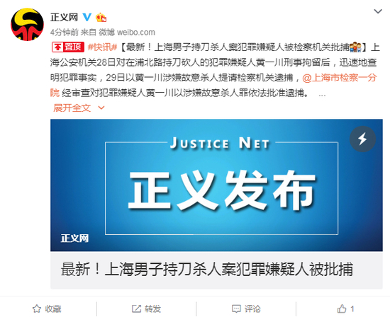 上海公安机关28日对在浦北路持刀砍人的犯罪嫌疑人黄一川刑事拘留后,迅速地查明了犯罪事实,29日以黄一川涉嫌故意杀人提请检察机关逮捕,@上海市检察一分院 经审查对犯罪嫌疑人黄一川以涉嫌故意杀人罪依法批准逮捕。