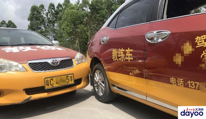近日上午10点18分,金唐交警大队接到报警称,金鼎某驾校练车场内两教练车相撞,急需交警处理。金唐交警接报警后立即赶到现场,发现粤C4××5学号教练车紧贴着粤C5××7学号教练车的车屁股,两车车损倒不严重,只是轻微刮花。