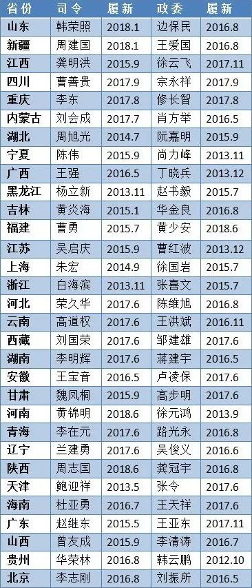 年初,政知见(微信ID:bqzhengzhiju)统述了全国31省(区、市)62名武警总队军政主官任职情况。这几天,这张表格的内容再次得到更新。