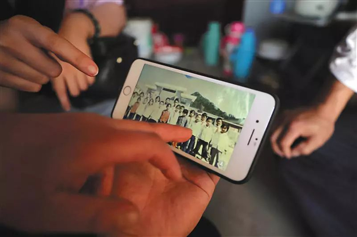 ▲5月29日,安徽六安金寨三合实验学校,苏明娟和当年自己的照片合影。图/视觉中国