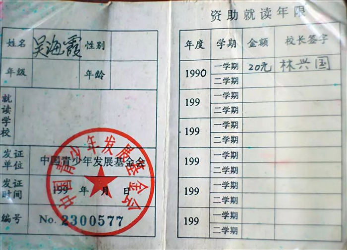 吴海霞是希望工程在金寨县首批资助的20个孩子之一。每个受资助的孩子都有一个64开的小本子,红色的塑料封皮,里面写着受资助人的信息和受助金额。