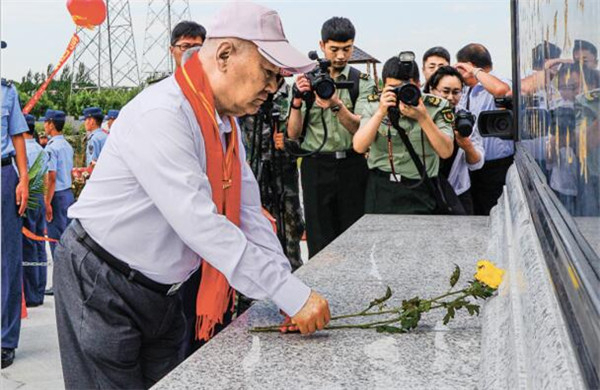 原沈阳军区司令员刘精松上将向纪念塔献花。