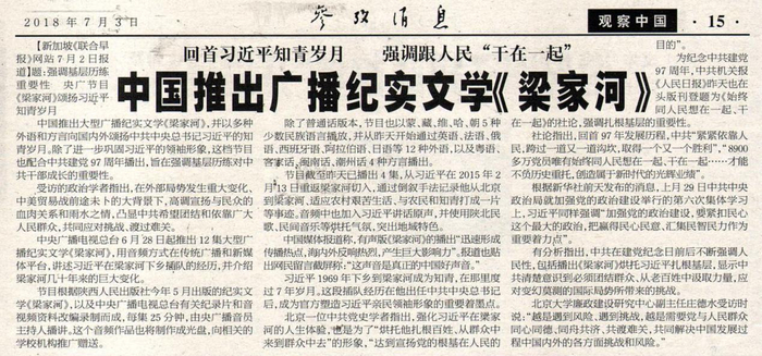 7月3日出版的《参考消息》通栏刊登新加坡《联合早报》网站7月2日刊发的文章“中国推出广播纪实文学《梁家河》”。文章主要内容如下: