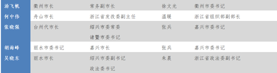 衢州市长汤飞帆(1972年3月);舟山市长何中伟(1970年10月);台州代市长张晓强(1975年11月)和丽水市委书记胡海峰(1972年11月)。