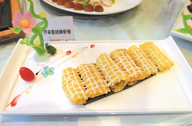 对于荔枝,在大朗有着颠覆味蕾的吃法。酒店的主厨们将九节虾去掉外壳,连同糯米糍的果肉,用丝网皮轻轻卷裹,入锅炸至颜色金黄。捞起沥油,均匀挤上芥末沙律酱。吃起来香脆可口、微辣清爽,更为奇妙的是辣中回甜,令人回味。