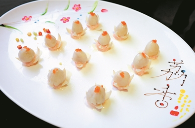 荔枝也可以用粤菜的传统方式,烹制出特别美艳的爽口点心。以原颗荔枝为食材手作而成的莲花荔枝酿,全身洋溢着冰清玉洁的冷傲气质。于新鲜荔枝肉裹上一层薄薄虾饺,既增加相应的质感,又可以锁住荔枝鲜汁,顶端撒上鱼子酱、底衬过水百合片,一朵朵鲜荷便跃然盘上。吃起来口感十足,弹牙爽口之余有一种爆浆的快感。
