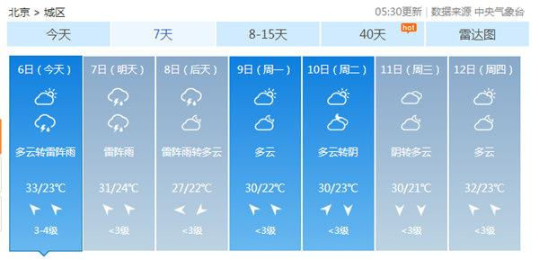 北京市气象台6日6时发布预报,今天白天晴转多云,午后西部北部有分散性雷阵雨,北转南风二三间四级,最高气温33℃;夜间多云转阴,大部地区有阵雨或雷阵雨,南风二级左右,最低气温23℃。