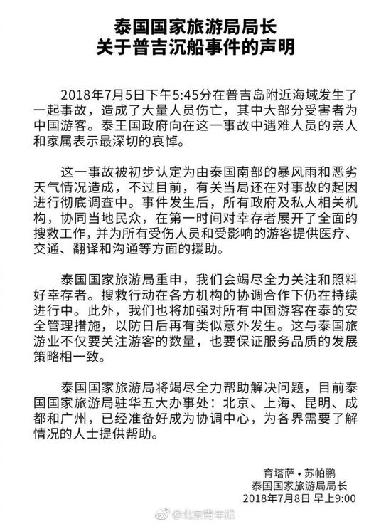 [泰国国家旅游局局长:沉船事故初步认定由暴风雨和恶劣天气造成]9日下午,泰国国家旅游局上海办事处官方微信公众号发布了泰国国家旅游局局长关于普吉沉船事件的声明。声明称,2018年7月5日下午5点45分在普吉岛附近海域发生了一起事故,造成了大量人员伤亡,其中大部分受害者为中国游客。这一事故被初步认定为由泰国南部的暴风雨和恶劣天气情况造成,不过目前,有关当局还在对事故的起因进行彻底调查中。泰国国家旅游局重申会竭尽全力关注和照料好幸存者。搜救行动在各方机构的协调合作下仍在持续进行中。此外,泰国国家旅游局也将加强对所有中国游客在泰的安全管理措施,以防日后再有类似意外发生。(北青报记者 屈畅 张雅)