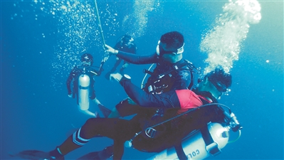 | 泰国普吉救援队成员在水下作业。新华社发 |