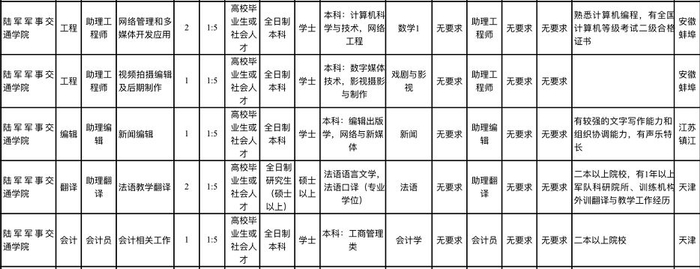 报名入口军队人才网中已经给出了所有岗位的统计表,政知君注意到其中涉及的行业、学科以及就业地点十分广泛,下图中截取了部分岗位供读者参考。需要提醒的一点是,岗位虽多但每人只能报考其中一个岗位。