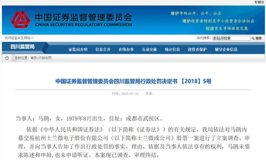对于上述人等的内幕交易行为,四川证监局分别处以没收所得以及罚款等处罚。其中,对马鹃内幕交易行为处以5万元罚款,对潘敏智没收违法所得3.99万元,并处以11.96万元罚款。