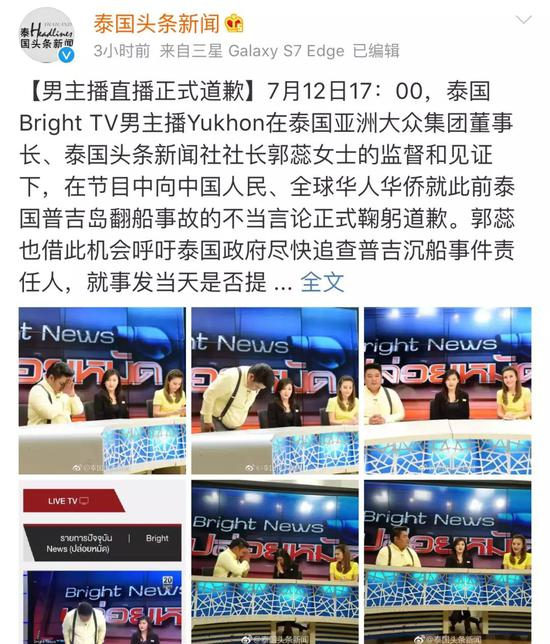 “我传达了不好的讯息,使得中国兄弟们、泰国华裔、全球华人华侨伤心和生气,对我播报的新闻充满不满,我承认我的用词和播报的确不好,没有三思而后言,我正式向大家道歉。”