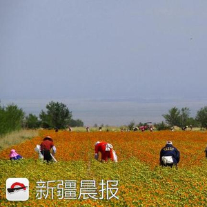 采摘工正在采摘红花裕民县裕隆红花种植农民专业合作社今年种植了2000多亩红花,目前已雇了90多名工人来采摘红花。红花采摘完以后,红花籽还可以榨油。在裕民县,一亩旱地红花可产红花籽二三十公斤,一亩水浇地红花可产红花籽八九十公斤,平均4公斤左右的红花籽可榨出1公斤红花油,在当地1公斤红花油可卖到23元左右。