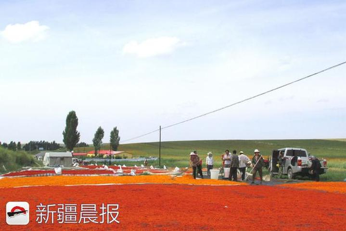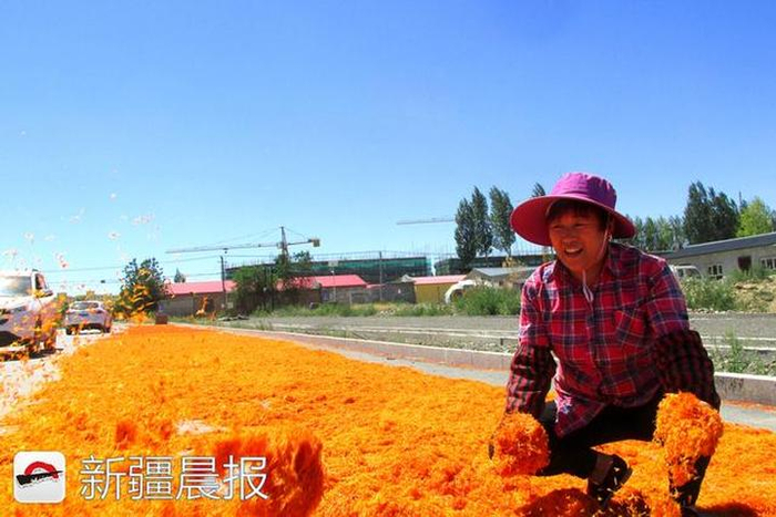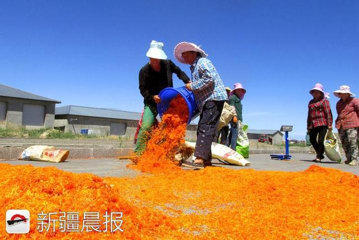 裕民县种植户正在晒红花一般4公斤鲜红花可晒出1公斤红花干丝,将鲜红花晒成干红花大约需要3天时间,目前裕民县红花种植户的庭院里都晒着红花。
