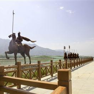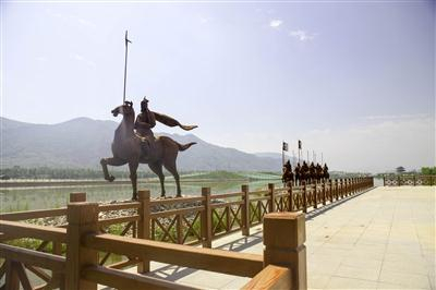 ●走进二号湖片区,给人印象最为深刻的是两道堤坝形成的瀑布,一号湖和二号湖之间的堤坝为古城墙形状的,河水从低的城墙间隙流下,形成一个个小瀑布。从二号湖到三号湖的堤坝上,设有一队驼队雕塑,表现的是商队迁徙的故事。