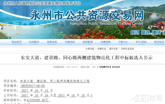 于是,记者再致电东安县政府办公室,对方又要求询问东安县重点办和东安县城建投公司,但两单位均回应称不清楚。通过检索公开资料,记者从永州市人民政府制定的公共资源交易信息发布平台——永州市公共资源交易网获悉,东安大道、建设路、同心路两侧建筑物亮化工程中标价约为4100万元,也就是说,东安县为这三条路亮化花费超过4000万元。