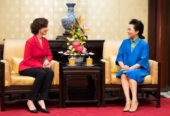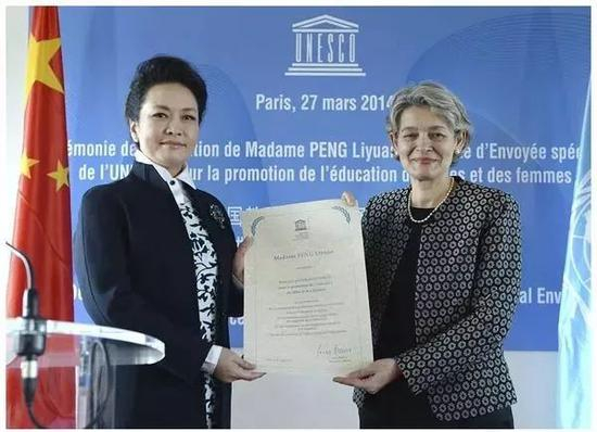 2014年3月27日,随同习近平访欧的彭丽媛,在联合国教科文组织总部接受了该组织授予的“促进女童和妇女教育特使”荣誉称号,时任总干事博科娃为她授予特使证书。