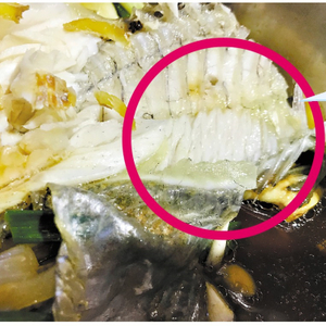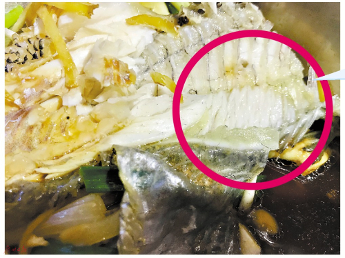 近日李女士向本报报料称,清蒸的鲈鱼鱼刺、脂肪部分竟呈绿色,她担心是添加孔雀石绿导致的。“鲈鱼绿色脂肪这个问题网上有很多反映,却没有权威答案,这是我第一次看到。”记者从李女士提供的照片看到,在白皙的鱼肉边上,附着的脂肪确实呈淡绿色,在一些鱼刺部位也有绿色。