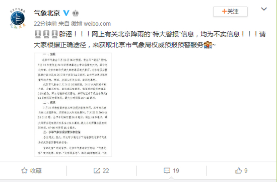 北京降雨特大警报?气象台紧急辟谣 政府网站 2018.07.2412:01 关注 来源:气象北京 辟谣!!!网上有关北京降雨的“特大警报”信息,均为不实信息!!!请大家根据正确途径,来获取北京市气象局权威预报预警服务