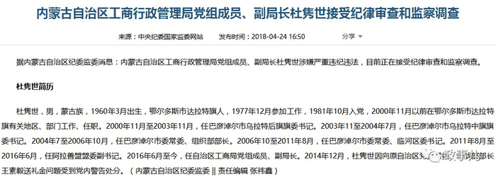 7月23日傍晚,内蒙古自治区纪委监委消息:日前,经内蒙古自治区党委批准,内蒙古自治区纪委监委对自治区工商局党组成员、副局长杜隽世涉嫌严重违纪违法问题进行了立案审查调查。