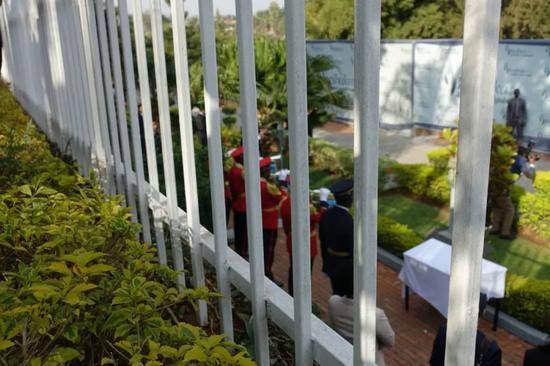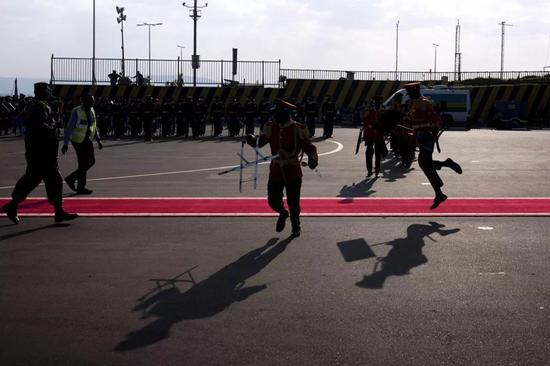 △机场欢送仪式开始前,军乐团成员跳过红地毯。在卢旺达,除了元首以外,其他人不可以踩上仪式专用红地毯。(央视记者王哈男拍摄)