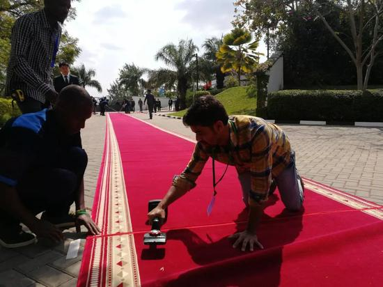 △工作人员正在整理红地毯。(央视记者李铮拍摄)