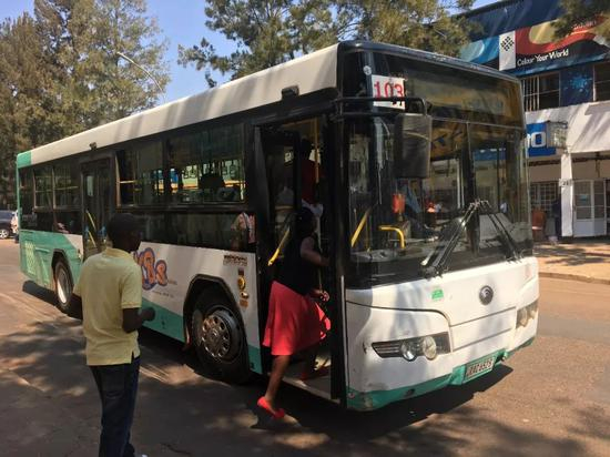 这个场景很熟悉吧,这是中国产的公交车正在停靠上客。