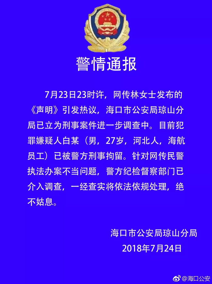 今日(24日)中午,@海口公安发布其账号的第一条官方微博对该案进行通报称:海口市公安局琼山分局已立为刑事案件进一步调查中。目前犯罪嫌疑人白某(男,27岁,河北人,海航员工)已被警方刑事拘留。