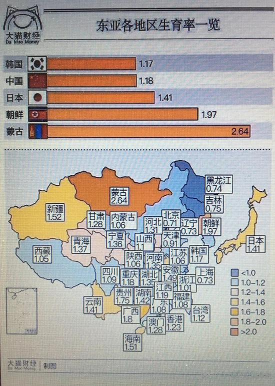 当下东三省的生育率,分别以0.73、0.74、0.75在全国各省中垫底,比全国平均线1.18差了一截,更比饱受“少子化”困扰的日本差了近一倍。