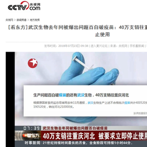 武汉市食品药品监督管理局网站7月13日发布的2018年6月行政处罚信息公开表中显示,武汉生物制品研究所有限责任公司(以下简称武汉生物)生产的吸附无细胞百白破联合疫苗(批号:201607050-2,规格:0.5ml),经检验,其效价测定项不符合标准规定、被判定为不合格。