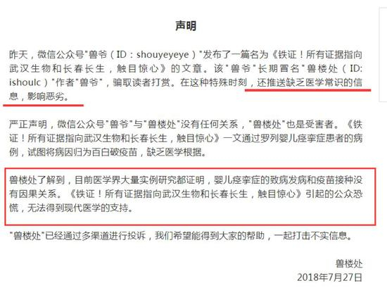 真“兽爷”在声明中写到:“目前医学界大量实例研究都证明,婴儿痉挛症的致病发病和疫苗接种没有因果关系。《铁证!所有证据指向武汉生物和长春长生,触目惊心》引起的公众恐慌,无法得到现代医学的支持。”