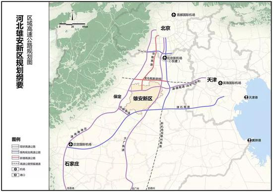 新区规划纲要提出“完善雄安新区与外部连通的高速公路、干线公路网,构建‘四纵三横’区域高速公路网。