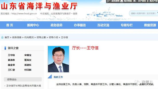 据公开资料,王守信出生于1964年9月,山东昌邑人,早年长期在青岛工作,曾任青岛市环保局办公室副主任,青岛市海洋与渔业局副局长,后任山东海洋与渔业厅副厅长。2013年3月,出任山东省海洋与渔业厅厅长、党组书记至今。