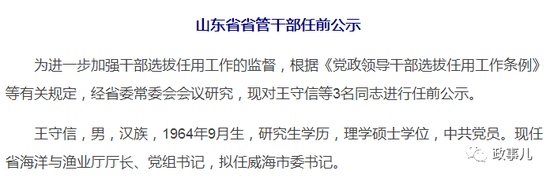 任前公示显示,王守信,男,汉族,1964年9月生,研究生学历,理学硕士学位,中共党员。现任省海洋与渔业厅厅长、党组书记,拟任威海市委书记。”公示期限为“2018年5月9日至5月15日。