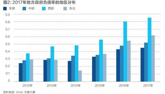 我们对区域内省份的负债率进行简单算术平均,得到这一区域的平均负债率水平。从地区负债率水平来看,除个别年份以外,所有地区的负债率水平均有所上升,但各个地区表现不一致。其中,东部、中部省份的负债率水平比较接近,且在2012年-2017年间保持稳定,并显著低于60%,整体风险可控。而西部和东北省份的平均负债率高于60%,严重高于东、中部省市,不仅如此,两者的负债率水平在这些年不断上升,增长迅速,债务风险十分突出。