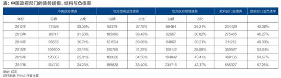 结合财政部公布的数据,中央政府债务余额2012年为7.75万亿元,2017年为13.47万亿元,新增债务5.72万亿元,年均增速11.68%。我们可以加总得到中国政府部门全部的债务存量。2012年,中国政府部门全部债务为23.44万亿元,2017年该数字为55.63万亿元,新增债务32.19万亿元,年均增速约为18%。