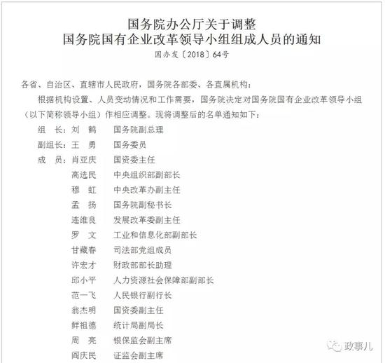 3天前的7月26日,中国政府网发布《国务院办公厅关于调整国务院国有企业改革领导小组组成人员的通知》。