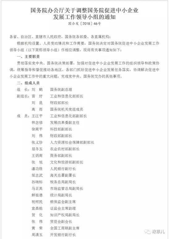 另外,在官方6月20日发布的《国务院办公厅关于调整国务院促进中小企业发展工作领导小组的通知》中,刘鹤担任了国务院促进中小企业发展工作领导小组组长。