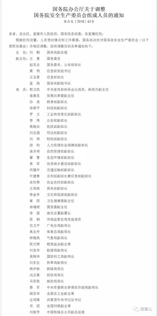 7月30日,中国政府网发布《国务院办公厅关于调整国务院安全生产委员会组成人员的通知》。