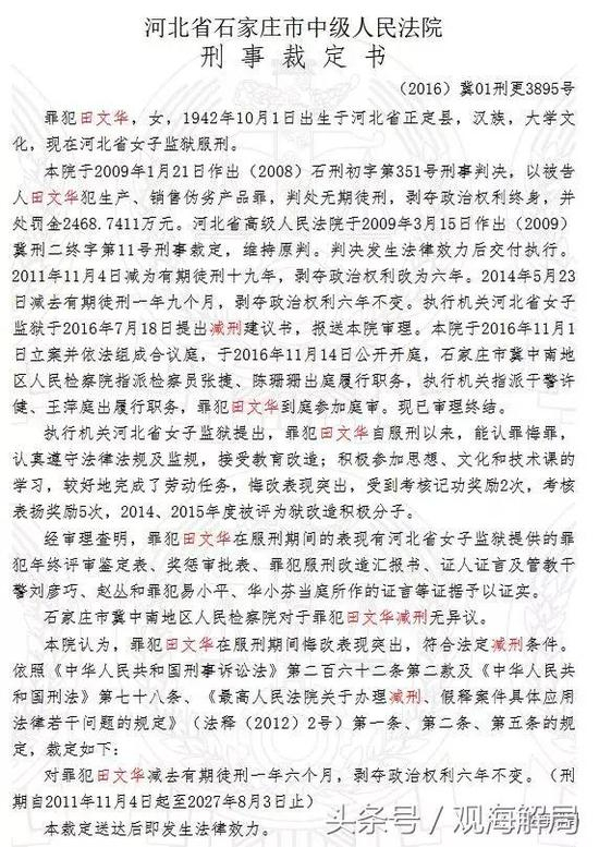 2016年年底,中国裁判文书网发布了(2016)冀01刑更3895号裁定书,裁定书显示,罪犯田文华,女,1942年10月1日出生于河北省正定县,汉族,大学文化,现在河北省女子监狱服刑。