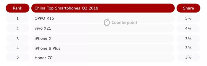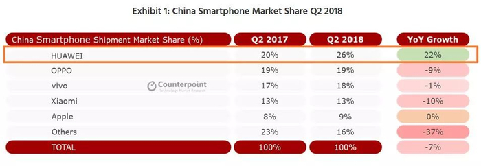 在智能手机出货量同比下滑7%的中国市场,华为是唯一一家实现出货量同比正向增长的手机品牌。2018年二季度,华为在中国市场的智能手机出货量同比大增22%,旗下荣耀7C手机也是这一季度销量排名前五的手机型号。
