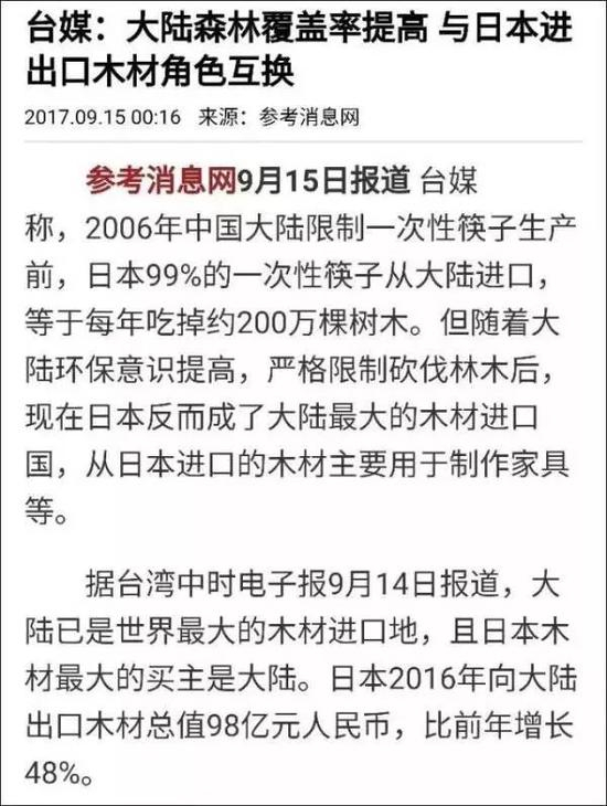 在2006年另一家报纸的报道中,一次性筷子和森林覆盖率仿佛也成了不共戴天之敌。